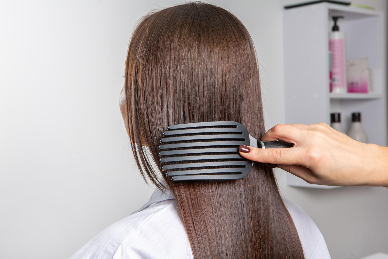 Lang anhaltend glattes, geschmeidiges Haar durch professionelle Glättbehandlung.