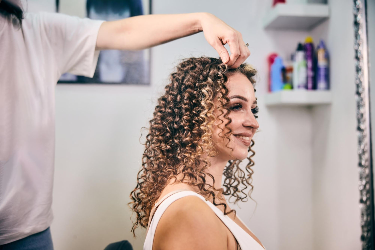 Definierte, schwungvolle Locken durch professionelles Waschen und Styling.